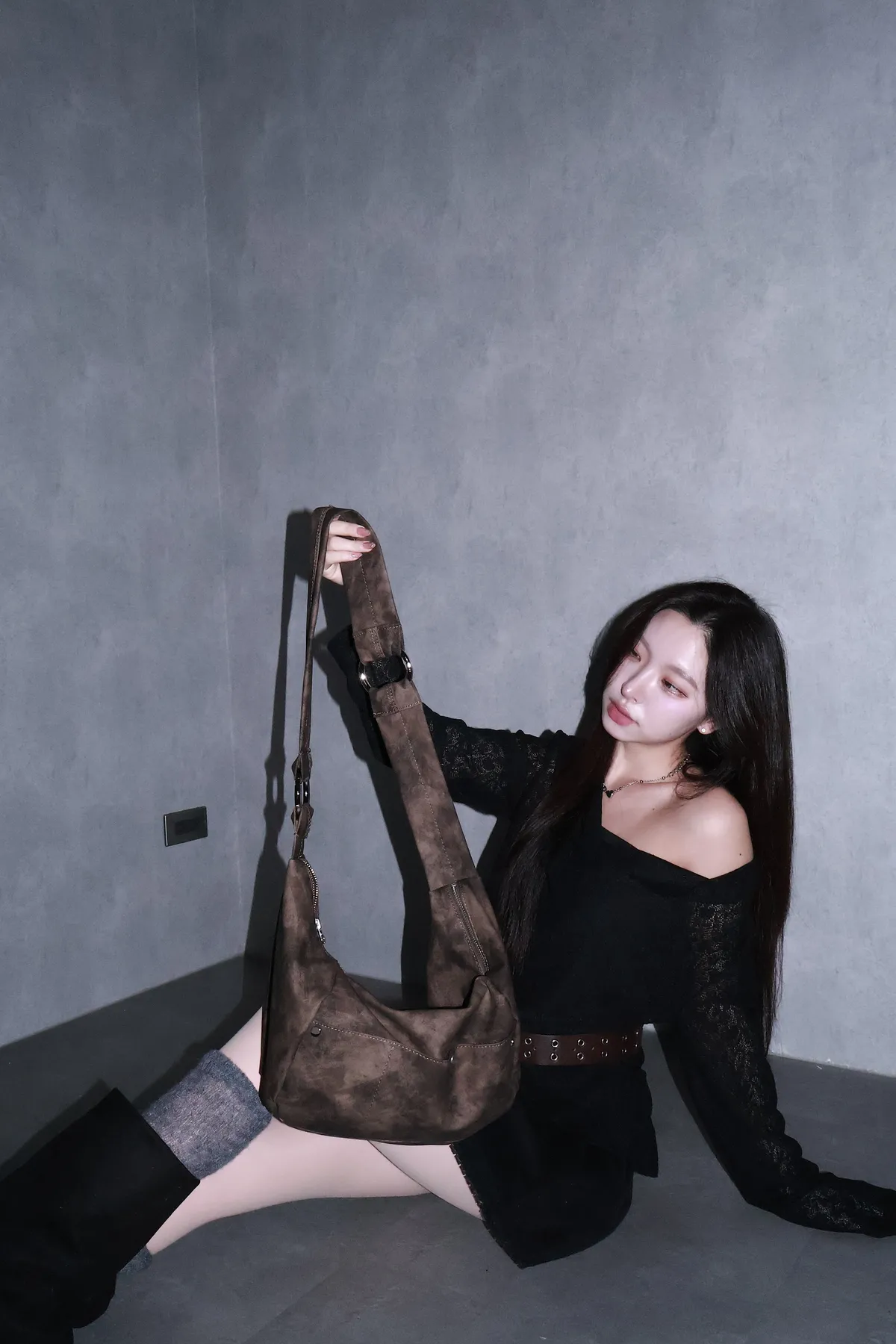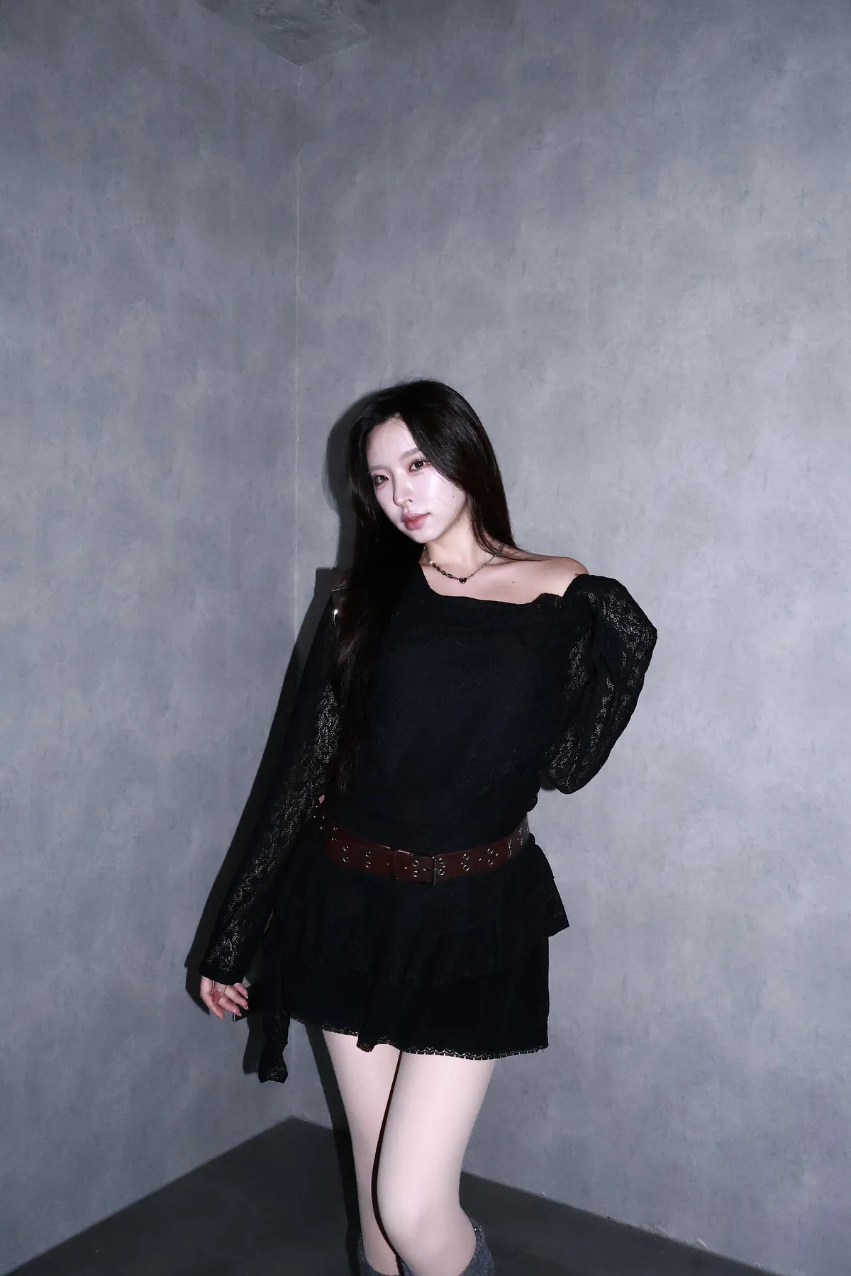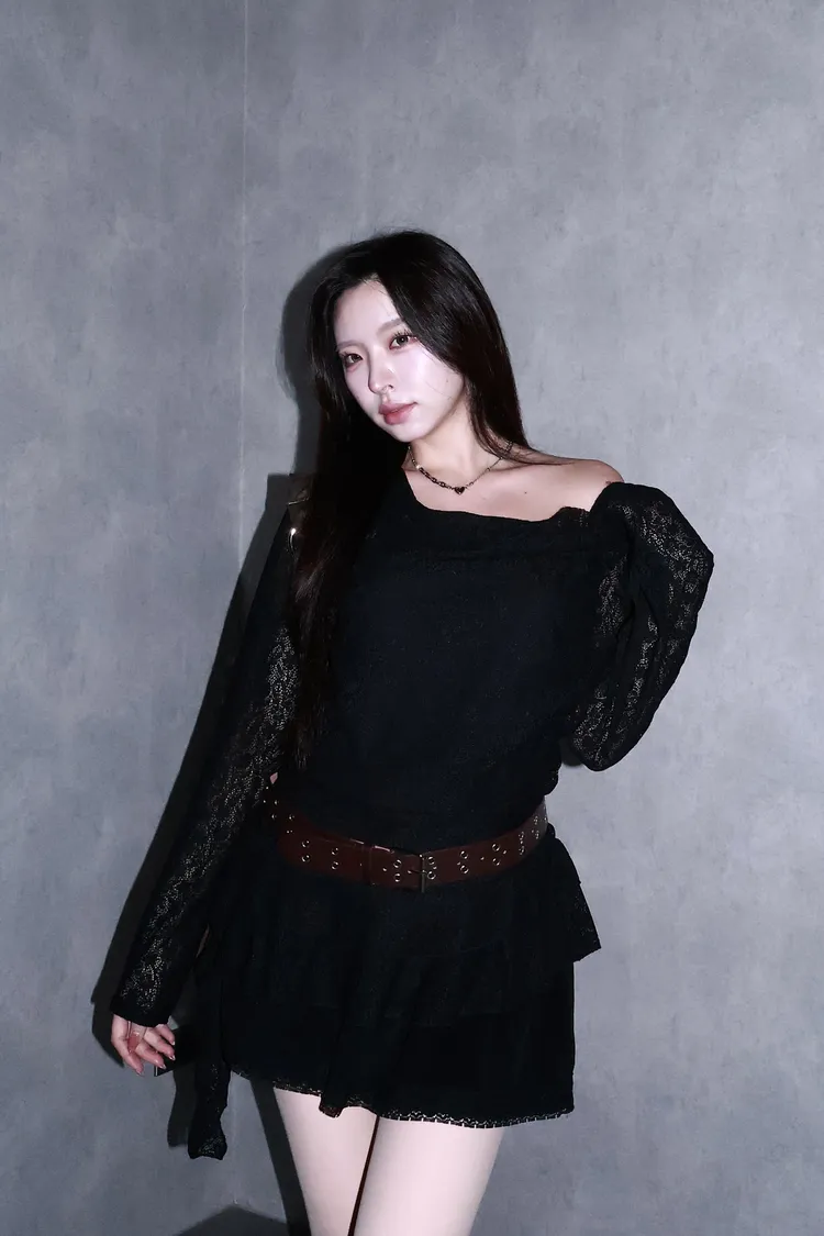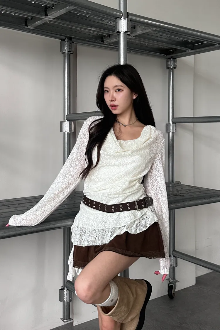 🇰🇷花語映雪魚尾巴鏤空上衣-附腰帶(黑/杏)