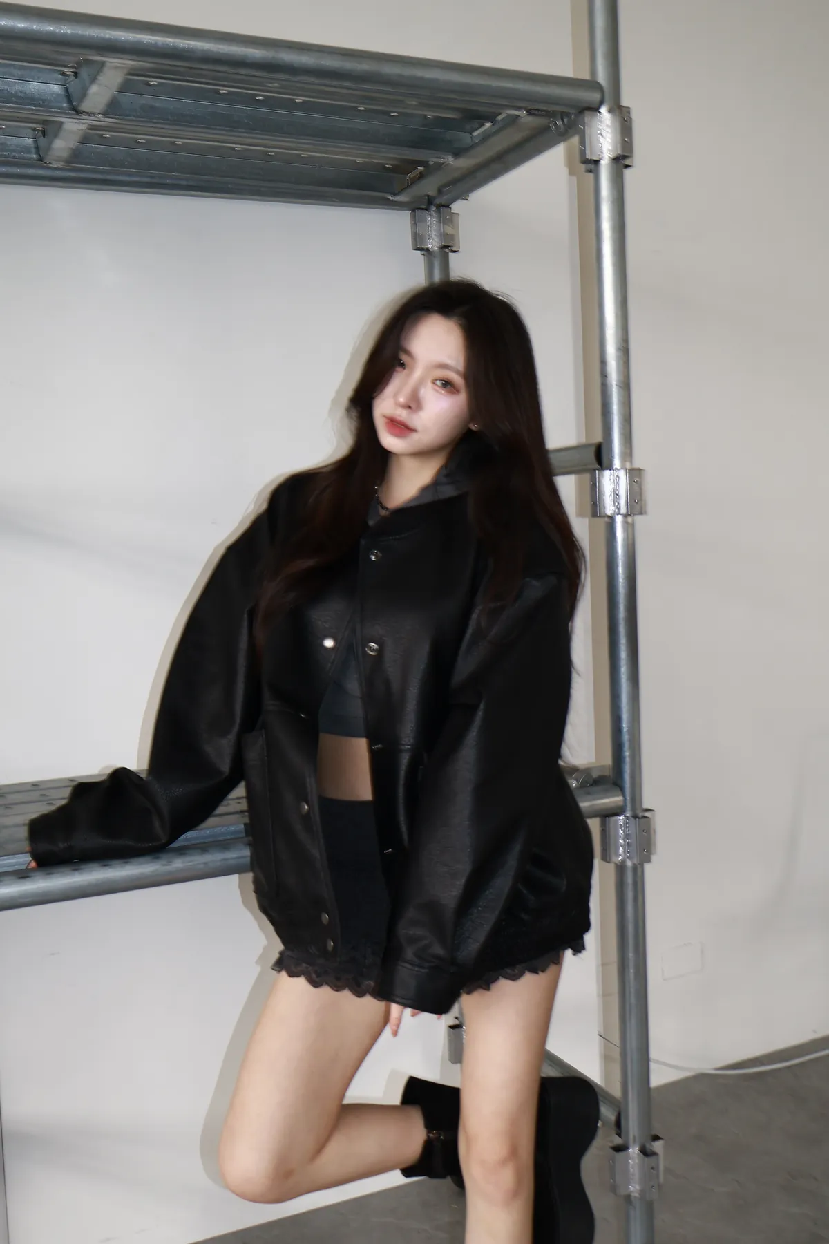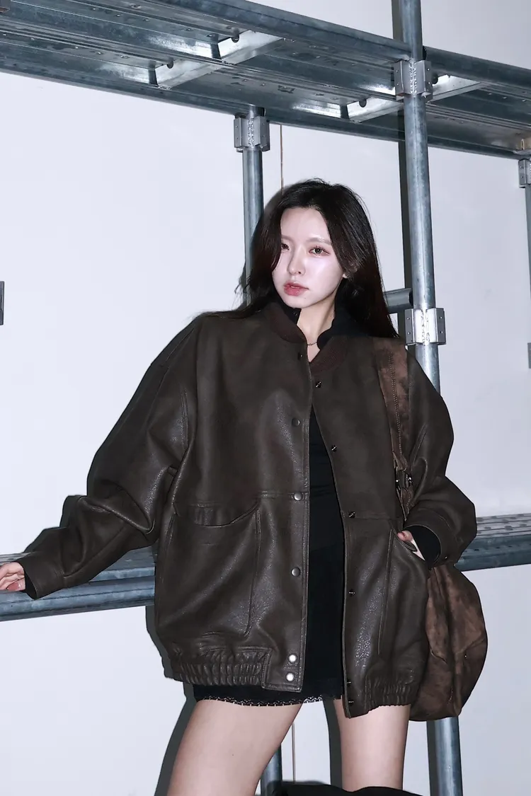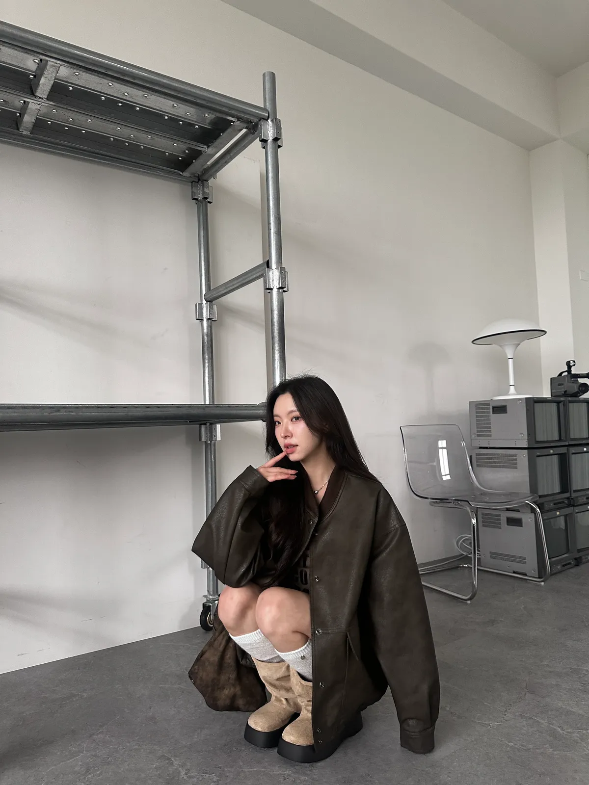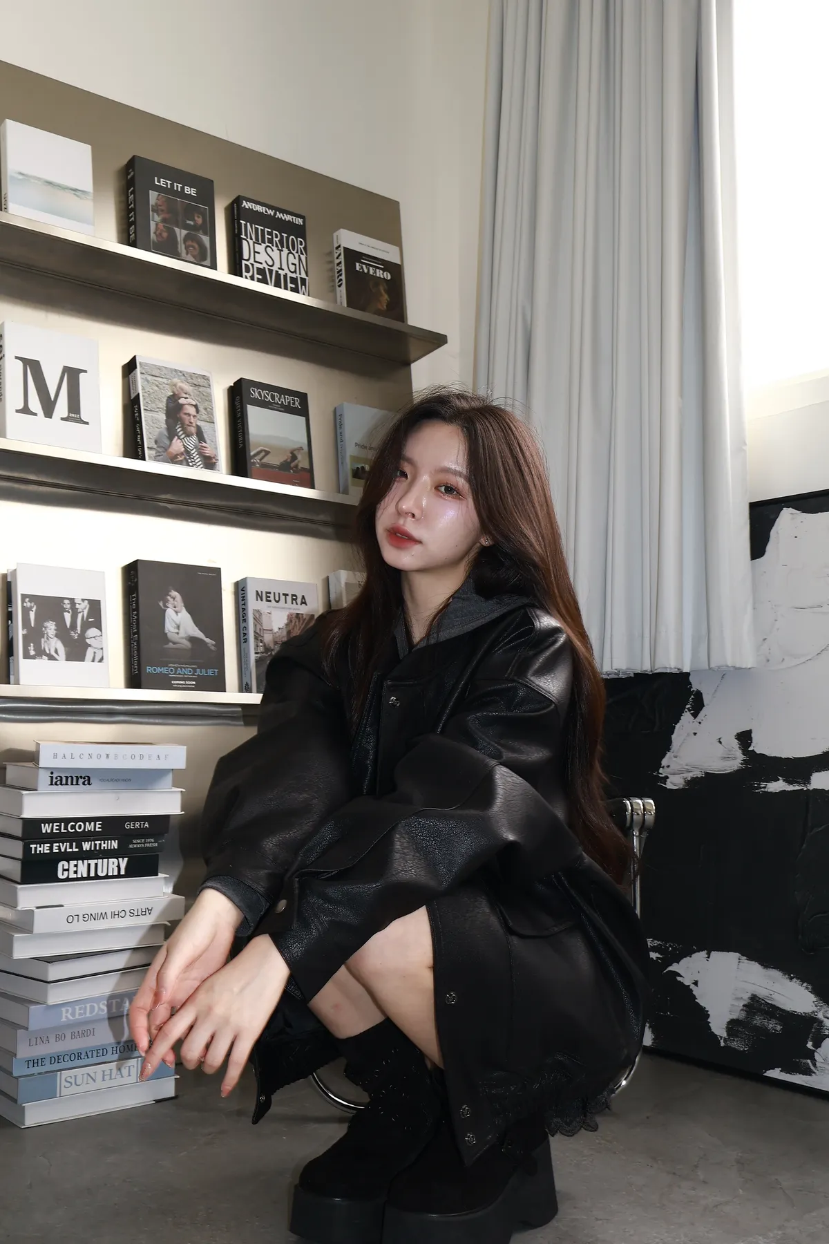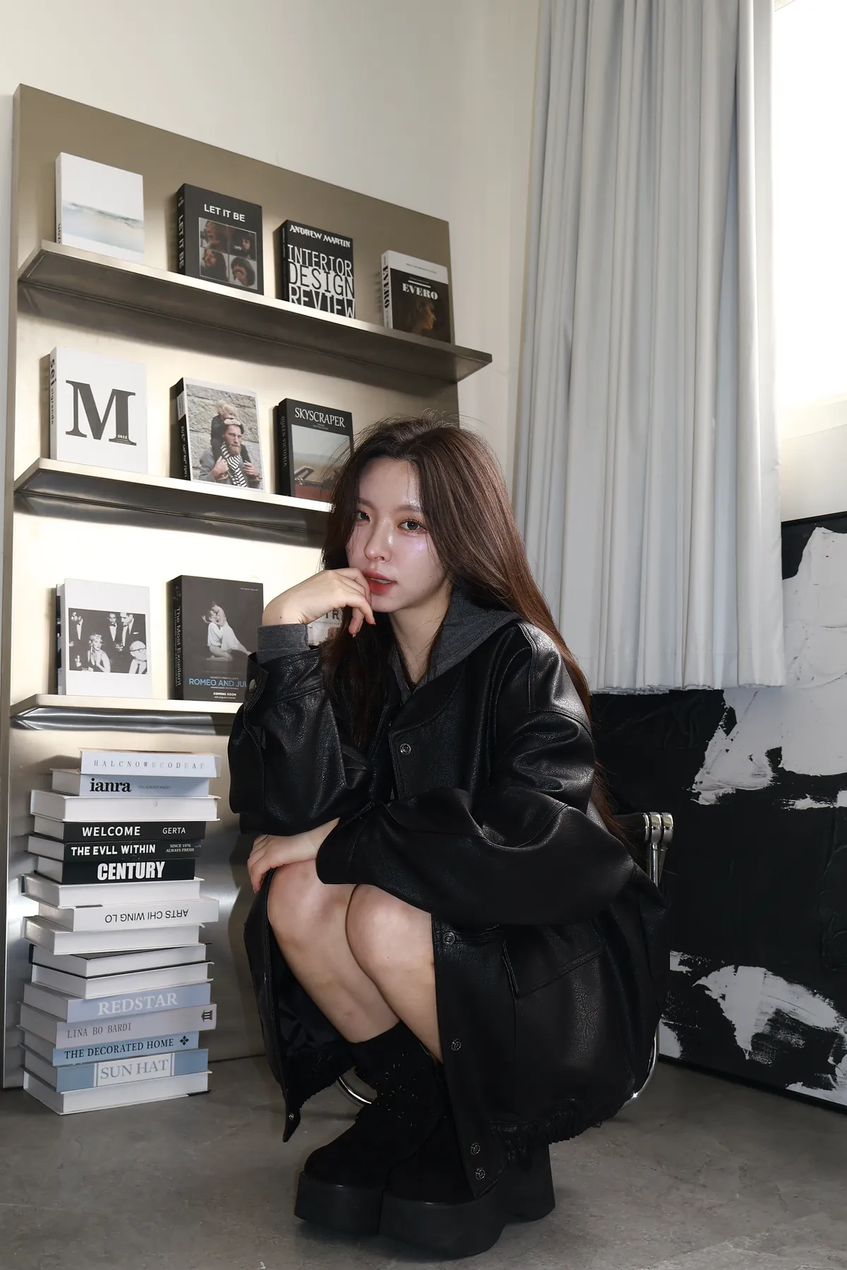 🇰🇷(智英包色)墨影流詩立領皮外套(黑/咖)